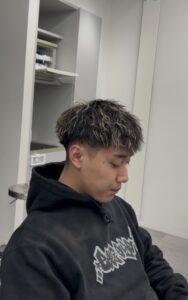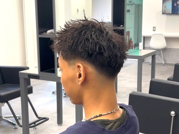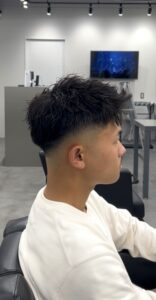 サイドとバックをグラデーション状に刈り上げることで、清潔感が一気にアップし、全体のバランスが引き締まります。スポーツ系やストリート系、きれいめファッションにも相性が良く、「大人っぽさ」と「男らしさ」を同時に演出できます。パーマの動きとフェードのシャープなラインが合わさることで、まさに今っぽいトレンドスタイルが完成します。